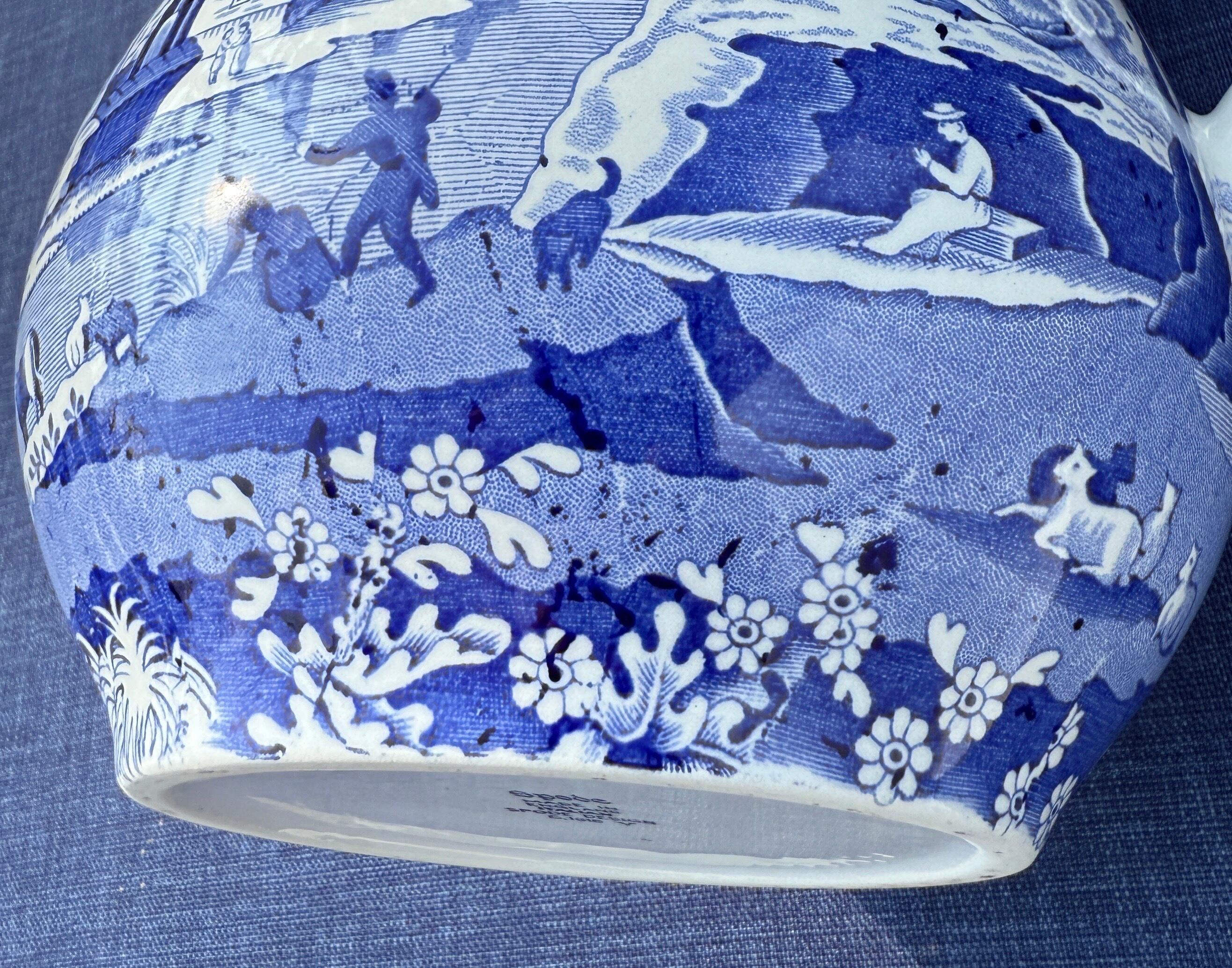 手作業での銅板転写の宿命なのですが、ピッチャー表面に黒いインクの飛びが見られます(写真6・7参照)。おそらく製造時のバックスタンプのインクによるものと思われますが、歴史を刻んで現代まで残った一点物ならではの個性としてご理解いただければ幸いです。